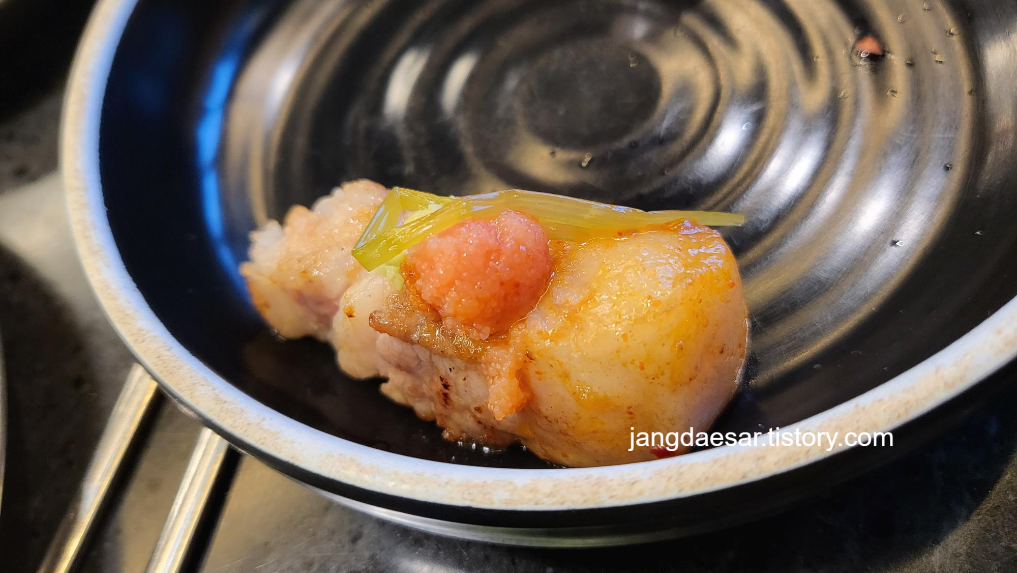 2. 멜젓에 담근 고기에 명란과 나물을 곁들여 먹기