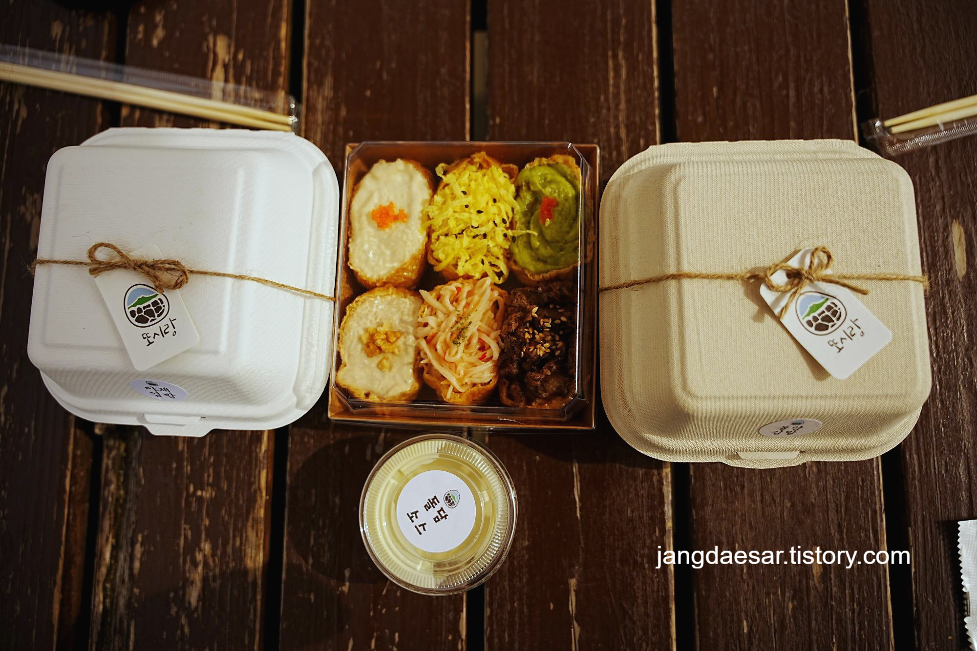 우리가 예약한 메뉴는 돌담김밥(흑돼지김밥), 또시랑유부, 야채김밥이다.