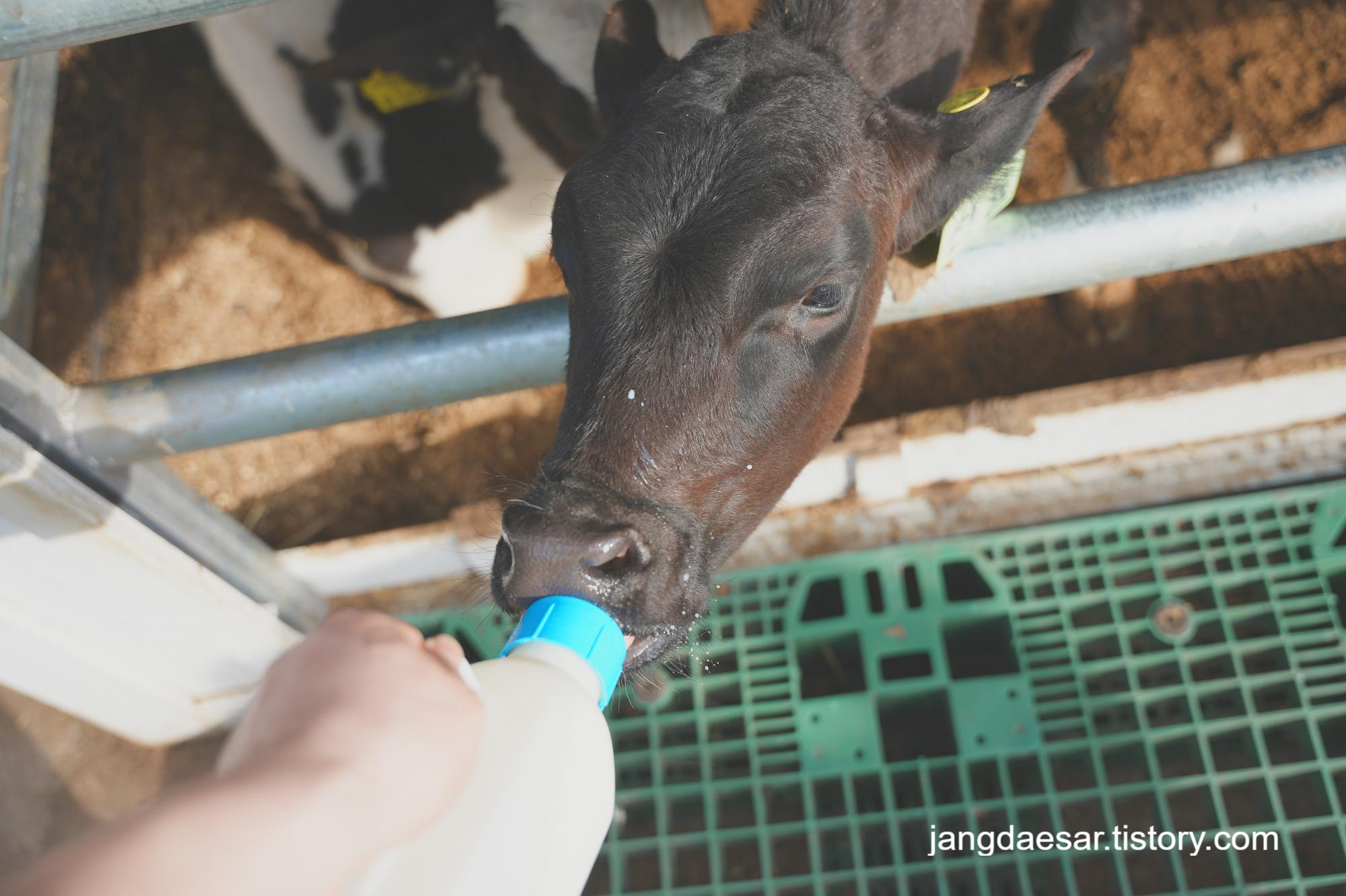 우유는 4개월 미만의 어린 송아지에게 우유를 주는 체험인데 가장 많은 실수를 하는 것이 검은색 고무덮개를 제거해야 한다. 나도 처음에 고무를 제거 안해서 열심히 아이들이 빠는데 우유가 안나와 미안했던..