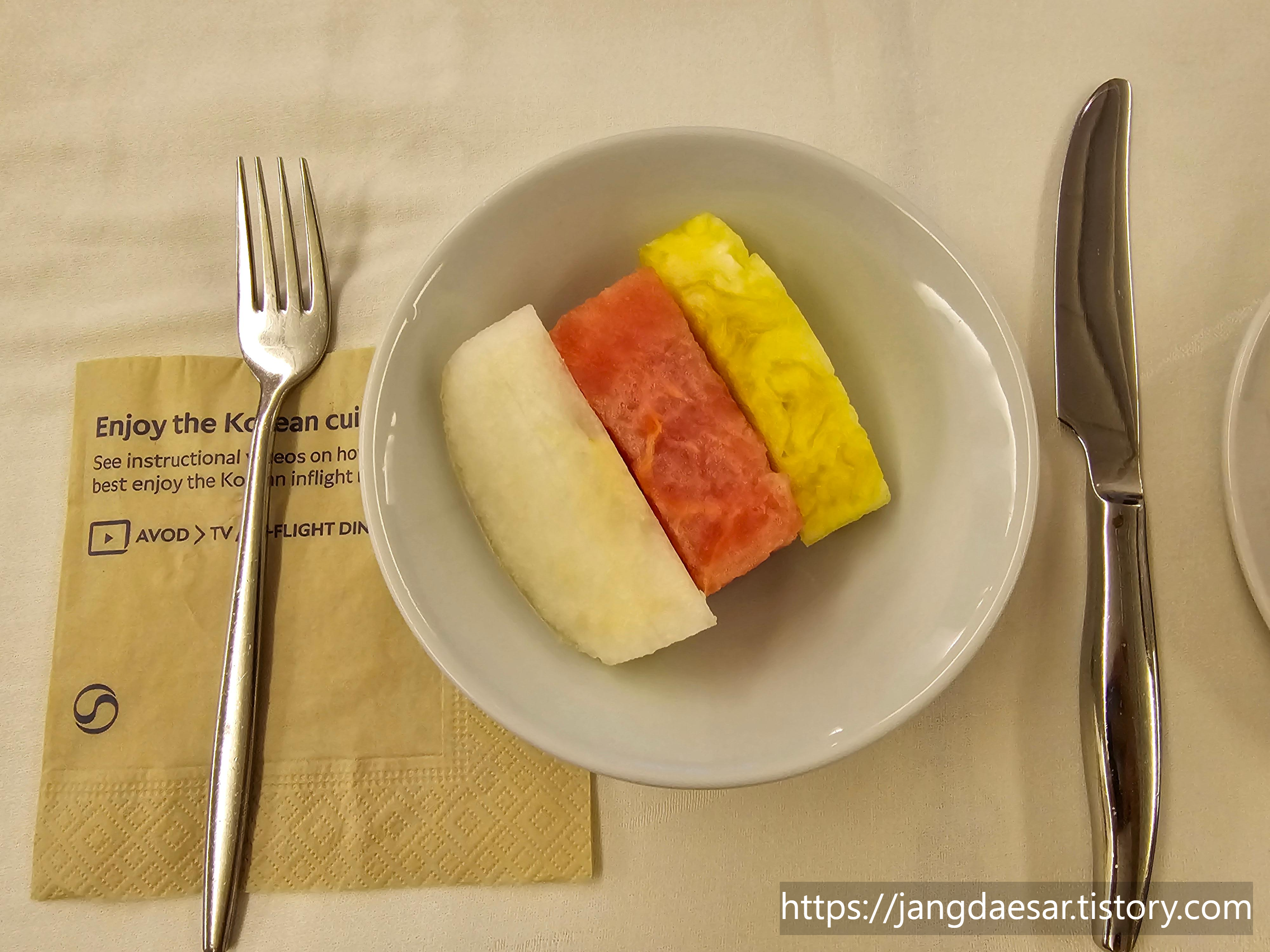 과일은 배, 수박, 파인애플이 각 1조각씩 나왔다.